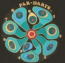 The rules of the dart golf games vary. Typically for the dartboards that are representation of golf courses, the player's score is determined by where in the area defining the hole the dart lands.[5][6] In general, if the player lands closer to the hole they will have a better score. For dart golf games that are played on either traditional dartboards or dartboards that are derivatives of traditional dartboards, the scoring is derived from landing the darts in the number related to the hole the player is on, the double, the treble, the 25 and the bull's eye such as Halex's Golf, A1Darts' Golf,[7] Dolf[8] and Apex Golf.
