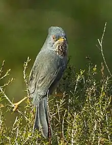 This species probably forms a superspecies with Tristram's warbler and this in turn seems close to Marmora's warbler and the Balearic warbler.[9][10] Altogether, this group of typical warblers bears a resemblance to the wrentit, the only species of Sylviidae from the Americas. However, the wrentit is less closely related to the genus Sylvia than to the parrotbills.[11][12] Its visual similarity to the Dartford warbler group is an example of convergent evolution.