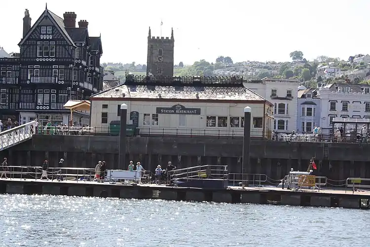 No railway has ever run to Dartmouth, but the town does have a railway station,[43] opened on 31 March 1890 to replace the original facility on the pontoon,[44] although it is now a restaurant. In fact Dartmouth Railway Station was built while the line from Paignton to the River Dart was still being built, anticipating a bridge across the river being built near the present Greenway Halt. The railway line to Kingswear was opened in 1864. As a result of shortage of capital, a deviation from the original scheme to run the line from Churston to Greenway with a steamer service to Dartmouth was proposed, but defeated in Parliament. It had been suggested that this could, at a later date, be used as a jumping off point for a bridge to the west bank of the Dart and a line direct to Dartmouth.[45] In 1900, a Light Railway scheme was proposed for a crossing of the Dart near Maypool to join another line from Totnes and then proceed to Kingsbridge and Yealmpton, with a branch to Salcombe.[46] This was also defeated by lack of funds. The railway terminated at a station called "Kingswear for Dartmouth" (now on the Dartmouth Steam Railway) and a ferry took passengers across the river to the station at Dartmouth railway station, which had a dedicated pontoon. British Railways formally closed the line to mainline passenger trains in 1973, but it immediately re-opened as a heritage line and has run as one ever since.