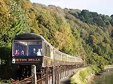 On 30 December 1972, the line was sold to the Dart Valley Light Railway Ltd, which at that time operated the nearby heritage railway that subsequently became the South Devon Railway. A winter service was operated from 1 January 1973, principally for the children at Churston Grammar School. There were two early morning services and two afternoon services. These were soon supplemented by a midday service each way, as the locomotive and stock were otherwise unemployed, but from the end of that summer it became a purely seasonal operation. The purchase price of the railway was £250,000 and a further £25,000 was paid for signalling alterations at Paignton. Most of this was recouped from the sale of surplus land, mainly at Goodrington, which was subsequently developed as flats, and at Kingswear, which became a marina. The Royal Dart Hotel at Kingswear was sold later.[10] British Rail retained ownership of the line from south of Queen's Park station to a point adjacent to the end of the sidings at Goodrington, including the station, which was operated under a running powers agreement, and which was acquired by the DVR Company in 2000.[11] A short section at and just south of the Sands Road level crossing at Paignton remains the property of Network Rail.