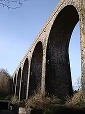 At this point, the Company funds were exhausted and a cheaper way of reaching Dartmouth was proposed. This was to build a line to Greenway Quay on the River Dart. The deviation would have had steep gradients of 1 in 56 and a zig-zag requiring the reversal of trains very close to Greenway House and another reversal lower down. Passengers would then have used a steamer to access Dartmouth. The Company pointed out that Greenway could be used at a later date for a jumping off point for a line crossing the river here and proceeding down the right bank of the river to Dartmouth itself. The relevant clauses of the deviation bill were defeated in Parliament, mainly because of objections from Mr. Harvey, the owner of Greenway. The rest of the bill became law by Act of 7 July 1862, authorising an extension of time for completion.[4] The route was returned to the original authorised route to run to Hoodown, later extended to Kingswear on the east bank of the Dart.[3] Construction was delayed while further sources of capital were sought. A major contributor was the formation of the Company directors into the Dartmouth Harbour Commissioners with powers to borrow money to improve the harbour and build a 'tramway' which would complete the line to Kingswear Point. The line was opened from Brixham Road to Kingswear for passenger traffic on 16 August 1864; goods were not conveyed until 2 April 1866. A steam ferry from Kingswear to Dartmouth was operated from the day of passenger opening. A pier (the 'Éclair pier') was built at Kingswear in addition to the ferry pontoon. The pier accommodated a service to the Channel Islands for some years. There was also, briefly, a service to South Africa. An hotel, the 'Plume of Feathers' was modified and renamed the 'Royal Dart' was intended to serve passengers for these and other hoped-for services. This section too was difficult, involving considerable earthworks, a 495 yard (453 m) tunnel, a masonry viaduct near Greenway and three timber viaducts on piles, across Longwood, Noss and Waterhead Creeks.[5][6]