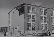 Damage sustained as a result of the bombing and debris from subsequent attacks was not repaired until after the war. When the Department of Health resumed control of the hospital, staff arriving in 1946 found roofs that leaked and broken equipment.[3] Other works that had been planned before the war, including landscaping and sealing of access roads were finally completed in 1950,[2] but many staff were forced to live in war-time Army huts until well into the 1960s.[3] During the late 1940s, poor living and working conditions persisted and prolonged industrial action damaged the hospital's reputation.[6][7]