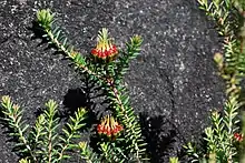 This shrub is found in a small area near Wandering in the South West region of Western Australia.[2] It is distributed throughout five localities in the Jarrah Forest biogeographic region, occupying an area of approximately 9 square kilometres (3 sq mi) in the Monadnocks Conservation Park and neighbouring Boonering State Forest. All known populations are found amongst granite outcrops and their drainage lines growing in shallow granitic clay loam soil with broken rock. Associated species include Allocasuarina humilis, Andersonia species, Grevillea bipinnatifida, Grevillea manglesii, Banksia recurvistylis, Hakea undulata, Hakea trifurcata, Verticordia insignis, Calytrix depressa, Xanthorrhoea preissii and Hibbertia hypericoides.[1]