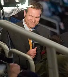 As the Stars' color commentator he is known for his deep vocabulary of descriptive words that he uses with almost comedic timing. His most frequent is "larceny", used when a goalie makes a spectacular save.