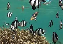 Dascyllus abudafur, the Indian Ocean humbug, is a species of ray-finned fish from the family Pomacentridae, the clownfishes and damselfishes. It is found from the Red Sea, along the coasts of eastern Africa to South Africa, the Seychelles, Comoros, Madagascar and Mascarene Islands east to the Sunda Islands. It has been classified as synonymous with the Pacific humbug Dascyllus aruanus and is not included in FishBase[2] but studies have shown that the two taxa were shown to be genetically and morphologically different.[3] The specific name is derived from the Arabic word for this species Abu-dafur Jabûd.[4]
