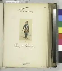 Following the beginning of the Revolution in Paris, a new 'Provisional Ordnance' was published on 1 April 1791, where new 'republicanised uniforms' were introduced. Under this reorganisation, each 6 regiments (for instance the 1st–6th or 7th–12th) were grouped into uniform divisions. In addition to the new uniform, the regiment was moved far up in the precedence line to became the 12th, now falling after the Royal Roussillon Cavalry Regiment (11th) and Orléans Cavalry Regiment (13th). The new uniform now consisted of the following: black bicorne with a white and back cockade, green bottom and jonquil yellow topped plume, jonquil yellow cuffs, reverses, facings, turnbacks, button flap trim, and turnbacks, 'Republican Blue' coat, epaulettes, and vertical pockets, white small clothes, trousers, and white trimmed [blue] saddles.[17][18]