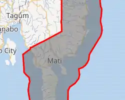 Davao Oriental (Cebuano: Sidlakang Dabaw; Tagalog: Silangang Davao) is a province in the Philippines located in the Davao Region in Mindanao. Its capital is city of Mati, and it borders the province of Davao de Oro to the west, and Agusan del Sur and Surigao del Sur to the north. The province is the traditional homeland of the Mandaya and Kalagan/Kaagan.