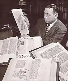 David Anton Randall (5 April 1905 – 25 May 1975) was an American book dealer, librarian and bibliographic scholar. He was head of Scribner's rare book department from 1935 to 1956, librarian of the Lilly Library and Professor of Bibliography at Indiana University. Randall was responsible for the sale of two copies of the Gutenberg Bible.[1][2] As a practitioner of bibliology with a bibliophiliac addiction, a raconteur of history of books, and an avid collector, he developed a keen appreciation for books as physical objects—including the tasks of collecting, cataloging, finding and preserving them.