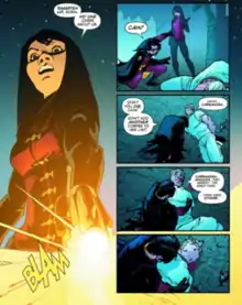 Following the One Year Later continuity jump, Robin captures Cain and brings him to the League of Assassins as ransom to save Cassandra, only to find that Cassandra is their leader. Cassandra explains that she chose to join the League because she found that Cain had trained other children in addition to her.[6] Her actions were later explained to be the result of Deathstroke injecting her with a mind-altering serum. After her speech, Cassandra handed Robin a gun to kill David, offering him a place in her League.[6] When he refused, she shot her father herself. Cain tells Robin that there were other girls in addition to Cassandra and Annalea before apparently dying. Afterwards, Robin and Cassandra fight. The battle ends when an explosion causes a fire to break out. By the time Robin returns to where he had left Cain's body, it is gone and the assassins' necks are broken.[1]