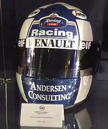 Coulthard's helmet design is blue and consists of a white saltire on the top which resembles the flag of Scotland and the four tips are trepassed from the top of the chin area. Coulthard borrowed a helmet belonging to Michael Schumacher for the 1996 Monaco Grand Prix as his regular helmet was suffering from steaming up during the weekend.[125] Upon Schumacher's first retirement in 2006, he suggested to Coulthard that he would swap one of his own helmets for one of Coulthard's, which was agreed by Coulthard.[126] For the 2007 Japanese Grand Prix, he changed his design to grey with a stylised saltire on the sides of his helmet, as an homage to the late World Rally Champion Colin McRae.[127]