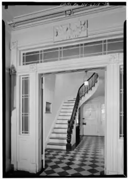 Architrave trim of an elaborate design gives a flaunting impression, and carved laurel details in rectangles above the doors are seen consistently. The free-standing stairs have mahogany balustrades and elegant brackets. A most curious detail of the staircase is the iconic newel post, a carved dolphin head. It is thought to be the work of a Massachusetts ship figurehead carver.[5] On the west end of the first floor, an alcove addition is now staged as a small library.[3]