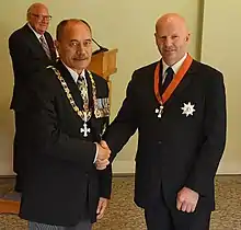 Fagan (right) in 2016, at his investiture as a Knight Companion of the New Zealand Order of Merit, by the governor-general, Sir Jerry Mateparae
