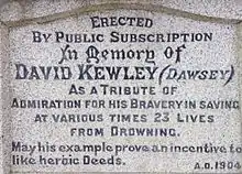 David "Dawsey" Kewley (1850 – 25 March 1904) was a Manx boatman, member of the Douglas Rocket Brigade and volunteer in the Lifeboat Service, renowned for his involvement in the saving of lives at sea. Reports of the number of people he saved from drowning vary. According to some contemporary reports he saved as many as 38 lives,[2] according to others 25,[3] but it is generally recognised that he was directly involved in saving the lives of at least 23 people, and as a member of the Douglas Lifeboat Crew assisted in the saving of many more. He was a recipient of numerous awards from the Royal Humane Society for his life-saving exploits.[4][5] Although a man of dauntless courage, he would never speak about his feats and disliked hearing other people talk about them.[2]