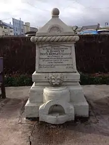The monument was erected by W. Cathcart of Glasgow and is made of Aberdeen granite.[28] It was originally a drinking fountain and water trough with the water issuing from the mouth of a stone lion. In the panel above the lion is a sculpture typifying one of Dawsey's rescues.[28] Originally situated at the apex of the Pier Buildings on the Victoria Pier[28] the monument was unveiled by the Deputy Governor of the Isle of Man, Deemster Thomas Kneen, on Thursday 8 June 1905.[28] Numerous civic dignitaries were in attendance and during the course of the ceremony two certificates from the Royal Humane Society were awarded to Samuel Webb, in recognition for his rescue of a young boy who's fallen into the sea off Douglas Promenade, and to G. Cowin for rescuing an elderly lady from Douglas Harbour.[28] At the moment of the unveiling salutes were fired from the Douglas Rocket Station and Douglas Head Lighthouse.[28]