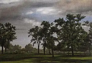 Klamen introduced a related series in 1996: his "Daimoku" paintings, which overlapped illusionistic images of the Lake Michigan landscape with small, repetitive white dots, each an index or record of his touch and a symbol of one, repeated Buddhist meditative chant ("daimoku").[51][1][37] In some cases the dots form a grid or pattern over the landscape, as in Untitled (Daimoku Landscape) (2016); in others, they nearly obscure it, leaving two images to occupy the picture plane.[22][10] Klamen sought to make this work "teeter on the edge" of various pictorial languages, in this case, Peirce's semiotic modes (iconic, indexical and symbolic) of representation, while also investigating painting as a process of enlightenment or self-knowledge, akin to meditation.[37][3] In 2002, Klamen also extended his vocabulary, creating dark landscape drawings, made by erasing into a sheet completely covered in graphite.[52][39]