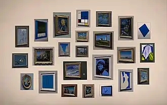 Klamen's "Meta Paintings" and "Re-mixes" (2009– ) feature paintings within paintings: carefully rendered "re-processings" of art-canon masterworks, depicted on exhibition walls (information tags included), often at oblique angles or in radically distorted form.[60][17] The "Meta Paintings" take liberties with color, scale, value range and composition, for example, using vantage point to impose diagonals on the flat horizontal and vertical harmonies of a Mondrian to problematize its absolutist purity of form, or obscuring Velázquez or Rembrandt images under layers of varnish that flatten them into dark, inky rectangles in gilded frames.[61] The works are further complicated by the juxtaposition of illusionary shadows on the painted wall with real shadows, and by the multiple planes of illusionary and real space.[62][61] In the "Re-mixes," Klamen warped well-known works by Monet, Picasso, Sargent and others, transforming them into jarring images that suggest liquefaction, visually, and art history in a state of flux, conceptually.[62] Klamen created both individual paintings and multi-canvas installations in this series. Untitled (Meta-Painting Multi-canvas installation), 2015, see right) is composed of 24 meta-paintings of masterworks prominently featuring blue that create what critic Lisa Wainwright called a "semiotic still life study" of disparate worldviews, aesthetics, and spatial illusions.[61] She and other critics observed that the series both adulates and questions the signification of painting, engaging viewers with humor, while foregrounding context and perspective with regard to authority, authenticity, market value and intertextual associations.[61][62][63]
