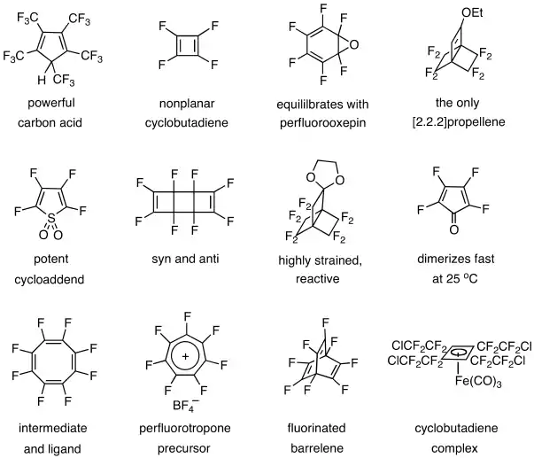 Other contributions include the preparation and studies of a powerful carbon acid,[33] tetrafluorocyclobutadiene,[34][35] hexafluorobenzene oxide,[36][37] a [2.2.2]propellene,[38] tetrafluorothiophene dioxide,[39] octafluorotricyclooctadiene,[40] a highly reactive propellane,[41] tetrafluorocyclopentadienone,[42] octafluorocyclooctatetraene,[43] a heptafluorotropylium salt, octafluorobarrelene ,[44] and a cyclobutadiene complex.[45]