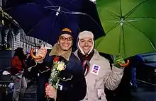 Born in Seattle, David Michael Barrett grew up in the San Fernando Valley neighborhood of Northridge. During his high school years, he was active in Jewish youth group BBYO: the B'nai B'rith Youth Organization, where he served as S'gan (vice-president) for the Southern California region. In college, he studied screenwriting and film production at California State University, Northridge, where he graduated summa cum laude, and was an active member of Zeta Beta Tau. He married Mark Peters on Feb. 16, 2004.[7] Barrett's chronicle of their wedding in the historic San Francisco 2004 same-sex weddings inspired the publication of a non-fiction collection of essays: Hitched! Wedding Stories from San Francisco City Hall,[8] edited by Cheryl Dumesnil, published by Da Capo Press (September 21, 2005). Barrett and Peters live in the Silverlake neighborhood of Los Angeles.[9]