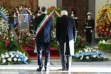 Sassoli died in the Oncology Referral Centre of Aviano on 11 January 2022, at the age of 65.[23][42] A state funeral was proclaimed and celebrated on 14 January in Rome at the Basilica of St. Mary of the Angels and of the Martyrs. The ceremony was presided over by Cardinal Matteo Maria Zuppi, archbishop of Bologna and great friend of Sassoli since adolescence.[46] As per his will, Sassoli was buried in the cemetery of Sutri, a city near Viterbo where he often spent his free time with his family.[47]