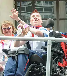 David John Smith OBE (born 2 March 1989 in Eastleigh) is a Paralympian who made his Paralympic debut on the British boccia team that won the gold medal at the 2008 Summer Paralympics. He competed for Great Britain at the 2012 Summer Paralympics[1] and did so winning Bronze in the Team BC1–2.[2] and Silver in the BC1 individual event watched by a record Boccia crowd at the Excel arena. David competed for Paralympics GB for a third time in Rio where he won Gold in the individual BC1 event for the first time in his career. In doing so, David has become the joint most successful British Boccia player in history. David currently holds the 'triple crown' of major tournament wins following his win at the World Championships in Liverpool 2018. David is now the holder of three Paralympic Gold Medals, after winning at the 2020 Tokyo Paralympics, making him the most decorated British Boccia player in history and the first BC1 to defend a Paralympic title, He was selected to carry the GB flag in the Tokyo 2020 closing ceremony.