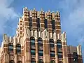 The building rises from a reddish granite base and incorporates buff-colored brick, marble (on the first three floors from the street), and limestone as its surface materials.[7] As with many of the other Detroit buildings of the era, it boasts architectural sculpture by Corrado Parducci.[7] The building features a series of setbacks from the 23rd floor upward.[10] The tower's tiered summit is brightly lighted with uplights on each facade and complements the similarly lighted Westin Book Cadillac Hotel downtown. The David Stott Building neighbors 1001 Woodward to the southeast. SkyBar Detroit opened in 2011 on the 33rd floor of the David Stott Tower but closed in 2015 after the building was purchased by Dan Gilbert's Bedrock Management Services.