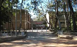 A meeting was called on 12 August 1971 at Wakehurst Public School. Representatives of the teaching staff and P.&C. Associations of Frenchs Forest, Wakehurst, Mimosa, and Belrose Public Schools, were advised by representatives of the Education Department of a proposed new school adjoining the grounds of Mimosa School. This new school would be known as Davidson High, with the anticipated completion date of January 1973.[4] The design of the school, drafted by architects Ian McHutchison, Douglas Anderson and Ronald Powell under the administration of the New South Wales Government Architect Ted Farmer, was termed a "Study 3 School". The design was created to be the 'go-to plan' for the majority of constructions in NSW state schools from 1971. Thus, Davidson High School was one of many created in this Brutalist style in the period, including Evans High School (1971, Blacktown), Mulwaree High School (1971, Goulburn), Galston High School (1972, Galston), Lake Illawarra High School (1972, Lake Illawarra), Kooringal High School (1973, Wagga Wagga), Casula High School (1973, Casula) and Macintyre High School (1974, Inverell).[5]
