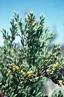 Daviesia crassa is a compact, dense, glabrous shrub that typically grows to a height of 1.8 m (5 ft 11 in) and has spreading to erect and often zig-zagging branchlets. Its leaves are reduced to crowded, thick, club-shaped phyllodes mostly 10–40 mm (0.39–1.57 in) long and 2–6 mm (0.079–0.236 in) wide. The flowers are mostly arranged in groups of three to five in leaf axils on a peduncle 3.5–6.0 mm (0.14–0.24 in) long, each flower on a pedicel 2–4 mm (0.079–0.157 in) long with egg-shaped bracts 0.5–1 mm (0.020–0.039 in) long at the base. The sepals are 4–5 mm (0.16–0.20 in) long and joined at the base, forming a bell-shaped base, the two upper lobes joined for most of their length and the lower three minute. The flowers are uniformly yellow, the standard broadly egg-shaped, 4.0–4.5 mm (0.16–0.18 in) long and 5.5–6 mm (0.22–0.24 in) wide, the wings spatula-shaped and about 4.5 mm (0.18 in) long and the keel about 4.5 mm (0.18 in) long. Flowering has been observed in January and the fruit is a flattened, triangular pod about 20 mm (0.79 in) long.[2][3]