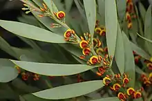 Daviesia daphnoides is a bushy or spreading shrub that typically grows to a height of up to 1.5 m (4 ft 11 in) and has ridged branchlets and glabrous foliage. Its leaves are reduced to more or less erect, narrow elliptic to egg-shaped phyllodes with the narrower end towards the base, 28–68 mm (1.1–2.7 in) long and 4.5–9 mm (0.18–0.35 in) wide. The flowers are arranged in groups of two to six in leaf axils on a peduncle 0.5–4.5 mm (0.020–0.177 in) long, each flower on a pedicel 0.75–3.0 mm (0.030–0.118 in) long with oblong to triangular bracts at the base. The sepals are about 4 mm (0.16 in) long and joined at the base, the two upper lobes joined for most of their length and the lower three triangular and 0.25–0.75 mm (0.0098–0.0295 in) long. The standard is yellow with a dark red base, 5.0–5.75 mm (0.197–0.226 in) long and 5–6 mm (0.20–0.24 in) wide, the wings dull red and yellow, 5.5–6.0 mm (0.22–0.24 in) long and the keel dark red and about 4 mm (0.16 in) long. Flowering occurs from April to July and the fruit is a triangular pod 15–21 mm (0.59–0.83 in) long with a tapering tip.[2][3]