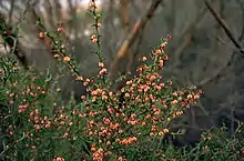 Daviesia decipiens is an intricately-branched, glabrous shrub that typically grows to a height of up to 1.8 m (5 ft 11 in). Its leaves are reduced to scattered, sharply-pointed oblong or tapering phyllodes 5–25 mm (0.20–0.98 in) long and 2–8 mm (0.079–0.315 in) wide. The flowers are arranged singly or in pairs in leaf axils on a peduncle 1.0–2.5 mm (0.039–0.098 in) long, each flower on a pedicel 0.75–1.5 mm (0.030–0.059 in) long with bracts about 0.5 mm (0.020 in) long at the base. The sepals are 3–4 mm (0.12–0.16 in) long and joined at the base, the two upper lobes forming a broad lip and the lower three triangular. The standard petal is elliptic, 5.0–6.5 mm (0.20–0.26 in) long, 5.5–8.0 mm (0.22–0.31 in) wide and orange with maroon markings, the wings 4.5–5.0 mm (0.18–0.20 in) long and red, and the keel 4.5–5.0 mm (0.18–0.20 in) long and crimson. Flowering occurs from June to September and the fruit is an inflated, triangular pod 11–12 mm (0.43–0.47 in) long.[2][3]
