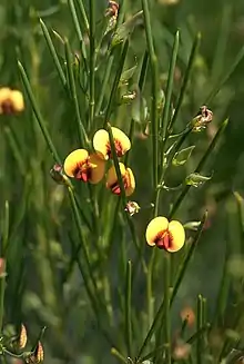Daviesia lineata is a species of flowering plant in the family Fabaceae and is endemic to the south-west of Western Australia. It is an erect, bushy shrub with scattered needle-shaped, sharply-pointed phyllodes and yellow and reddish flowers.