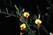 Daviesia mesophylla is a low-lying, glossy green, glabrous shrub that typically grows to a height of 1–2 m (3 ft 3 in – 6 ft 7 in) and has ridged branchlets. Its phyllodes are sharply-pointed, linear to narrowly egg-shaped with the narrower end towards the base, vertically flattened, 7–15 mm (0.28–0.59 in) long and 0.75–2.0 mm (0.030–0.079 in) wide. The flowers are arranged singly or in pairs in leaf axils on a peduncle 0.5–5 mm (0.020–0.197 in) long, each flower on a pedicel 4.0–5.5 mm (0.16–0.22 in) long. The sepals are 4.0–4.5 mm (0.16–0.18 in) long and joined at the base, the two upper lobes joined for most of their length and the three lower lobes triangular and about 1.0–1.5 mm (0.039–0.059 in) long. The standard petal is broadly egg-shaped with a notched centre, 7.5–8.0 mm (0.30–0.31 in) long and yellow to orange with a dark red centre, the wings about 6.5–7.5 mm (0.26–0.30 in) long and light red, the keel about 7.5 mm (0.30 in) long and cream-coloured. Flowering occurs from October to April and the fruit is an inflated triangular pod 12.0–14.5 mm (0.47–0.57 in) long.[2][3]