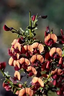 This daviesia grows in woodland or low heath and is found in the eastern Darling Range, but had a more extensive range in the past.[2][3]