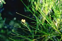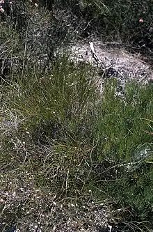 Daviesia pauciflora is an open shrub that typically grows to a height of up to about 30–80 cm (12–31 in) and has many ribbed stems. Its phyllodes are scattered and erect, linear and flattened, up to 400 mm (16 in) long and 1.0–1.5 mm (0.039–0.059 in) wide with parallel ribs. The flowers are arranged in leaf axils in racemes of up to three, the raceme on a peduncle 1–13 mm (0.039–0.512 in) long, the rachis up to 5 mm (0.20 in) long, each flower on a pedicel 1.5–10 mm (0.059–0.394 in) long with egg-shaped bracts 1.0–1.5 mm (0.039–0.059 in) long at the base. The sepals are 4–5 mm (0.16–0.20 in) long and joined for most of their length apart from five small lobes. The standard petal is broadly elliptic with a notched centre, about 8 mm (0.31 in) long, 10 mm (0.39 in) wide, and mostly yellow with a red base and yellow centre. The wings are about 6 mm (0.24 in) long and dark red with orange tips, the keel about 5 mm (0.20 in) long and dull brownish. Flowering occurs from October to January and the fruit is a flattened, triangular pod 11–14 mm (0.43–0.55 in) long.[2][3]