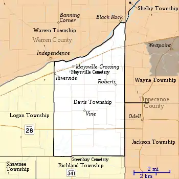 The township contains Maysville Cemetery, to the southwest of Maysville Crossing.[6] Salem Cemetery is also within Davis Township and is located southeast of the location marked Vine but north of State Rd 28.