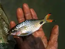 Dawkinsia filamentosa,[3] filament barb is a species of barb. Young fish have barely any color and black spots. They start having more color at three months old. The fish is a swift swimmer.[4] Males are larger than females and they fertilize eggs by swimming into the cloud of eggs.[5] The species is most commonly found in coastal floodplains near the Southwest Indian states of Kerala, Tamil Nadu and Karnataka. This species is also known as blackspot barb.[6]