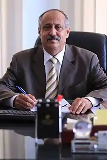 ![]() Dawood Al-Hidabi presenting at his office University of Science and Technology, Sana'a | |