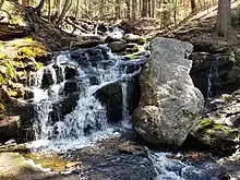 A multi-drop waterfall can be found along Day Pond Brook, dropping a total height of 40 feet (12 meters). The falls were once not well known and could not be accessed without bushwhacking. But in 2010, a spur trail was created by a Boy Scout to provide easier access to the falls for the public.[7]