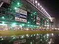 The Budweiser Party Porch was a 46-foot-high (14.0 m) porch located along the backstretch of the track. It was built on top of a portion of the backstretch grandstands and includes a 277-foot-wide (84.4 m), 33-foot-tall (10.1 m) sign, the largest sign in motorsports. The porch featured tables, food and drinks, offering fans a "fun-filled" atmosphere that breaks fans away from the confines of grandstand seating without sacrificing the view. Below the porch was an interactive fan zone featuring amusement rides, a go-kart track, show cars and merchandise trailers.[37] After the 2015 racing season, the Party Porch was torn down with the backstretch grandstands as part of the DAYTONA Rising project.