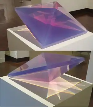 De Wain Valentine (1936 – February 20, 2022) was an American minimalist sculptor who was born in Fort Collins, Colorado. Often associated with the Light and Space movement in the 1960s, he is best known for his minimalist sculptures of translucent glass (such as Diamond Column in the collection of the Honolulu Museum of Art), fiberglass and cast polyester resin (such as Double Pyramid in the collection of the Honolulu Museum of Art) having slick surfaces suggestive of machine made objects. He lived and worked in Gardena, California.[1]