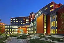 The modern, 120-bed facility was designed by HDR, Inc. and is LEED Gold certified,[4] incorporating sustainable and natural elements and themes. Fort Belvoir's new hospital has a seven-story main structure, flanked on each side by two outpatient clinic areas providing both primary and specialty care. In total, it consists of five total buildings, 3500 parking spaces, 44 clinics, expanded pharmacy services, 430 exam rooms, 10 operating rooms, two DaVinci surgical systems, two linear accelerator cancer/oncology systems, and one of the military's only dedicated substance abuse programs.
