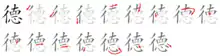 De "power; virtue" is written with the Chinese character 德 in both Traditional Chinese and Simplified Chinese. This character 德 combines the chi 彳 "footstep; go" radical (recurring graphic elements that suggest meaning) with zhi 直 "straight; vertical" and xin 心 "heart; mind". De 德 has rare variant characters of 徳 (without the horizontal 一 line) and 悳 or 惪 (without the 彳 "footstep" radical).