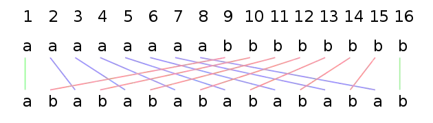 For example, to construct the smallest B(2,4) de Bruijn sequence of length 24 = 16, repeat the alphabet (ab) 8 times yielding w=abababababababab. Sort the characters in w, yielding w'=aaaaaaaabbbbbbbb. Position w' above w as shown, and map each element in w' to the corresponding element in w by drawing a line. Number the columns as shown so we can read the cycles of the permutation: