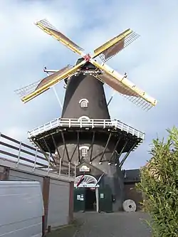 De Kroon was originally built in 1849 for Albertus Burgers. It stood at the junction of Amsterdamseweg and Rozenstraat, where it was known as De Hoop (English: The Hope)[Note 1]. The mill was demolished in 1870 and rebuilt in the Klarendseweg. Burgers owned the mill until 1886.[1] The Menno van Coehoornkazerne (an army barracks) was built nearby in 1885 and provided good trade for the mill. The barracks started grinding its own meal in 1900 and the mill's business declined. The mill was now owned by the Reymes brothers.[2] The stage collapsed on 13 July 1933,[3] but it was soon replaced. The mill was restored in 1936, but still ran at a loss.[2]