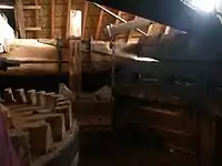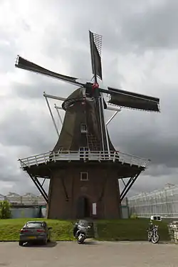 De Ropta is what the Dutch describe as a "stellingmolen". It is a smock mill on a two-storey base, there is a stage at second-floor level, 5.70 metres (18 ft 8 in) above ground level. The smock and cap are thatched. The mill is winded by tailpole and winch. The sails are Common sails. They have a span of 21.00 metres (68 ft 11 in).[3] The stocks are of interest in that one pair is of rivetted construction, made by the Gorter shipyard of Hoogezand, Groningen. The other stock, of welded construction, is claimed to be the first made by the millwright Christiaan Bremer of Adorp, Groningen.[1] The sails are carried on a cast-iron windshaft, which was cast in 1891 by De Prins van Oranje of The Hague, South Holland. The windshaft also carries the brake wheel, which has 61 cogs. This drives the wallower (32 cogs) at the top of the upright shaft. At the bottom of the upright shaft, the great spur wheel, which has 95 cogs. The great spur wheel drives two pairs of millstones via a lantern pinion stone nut which have 24 staves each. The millstones are 1.40 metres (4 ft 7 in) and 1.50 metres (4 ft 11 in) diameter, although one of the former is broken. The mill also drives two pairs of 1.70 metres (5 ft 7 in) diameter millstones which are used for milling pearl barley. These are driven by lantern pinion wallowers which have 20 staves each.[3]