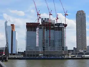 De Rotterdam is a building on the Wilhelminapier in Rotterdam, designed by the Office for Metropolitan Architecture in 1998. The complex is located between the KPN Tower and Rotterdam Cruise Terminal and was finalized at the end of 2013. On 21 November 2013, the municipality of Rotterdam, as the largest user, received the keys. The design provides space for offices, a hotel and apartments. The 44 floors amount to a total floor space area of about 160,000 m²,[1] making it the largest building in the Netherlands.[2]