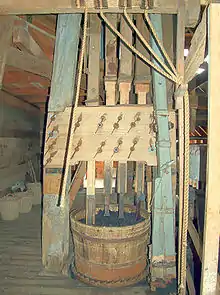 The first paper mill in the Zaan region was built in 1605.[3] De Schoolmeester was built in 1692.[1] It is also known by the nickname De Gauwdief.[4] The name De Schoolmeester (English: The Schoolmaster) probably denotes the occupation of one of the founders. The mill originally made grey paper. In 1778, the mill was powering two Hollander beaters. In 1852, the mill was bought by Gerbrand de Jong, who owned another wind-powered paper mill, De Kaarsenmaker at Zaandijk. He bought another nearby paper mill, De Vergulde Bijenkorf in 1854. In 1871, the mills were owned by Gebroeders de Jong, who demolished De Kaarsenmaker in the autumn of 1873. In 1877, the mill was modernised and a steam engine installed as auxiliary power. This meant that the mill was uninsureable against fire. In 1902, the nearby De Vergulde Bijenkorf burnt down. A steam driven paper factory was erected to replace it. This factory was able to make white paper. A fire started at De Schoolmeester in 1915 but was extinguished.[5] In 1948, the steam engine was replaced by a Ford gas engine. On 1 March 1949, the drying sheds were damaged in a storm, with over 30 metres (98 ft) of them being affected. They were rebuilt shorter than they had been previously.[4] On 28 August 1957, De Schoolmeester was sold to Vereniging van Nederlandsche Papierfabrikanten by the de Jongs.[5] In 1964, the gas engine was replaced by a Bernard diesel engine.[4] In 1977, the mill was bought by Vereniging Zaansche Molens.[3] The diesel engine was replaced by an electric motor in 1979.[4] A four-year restoration of the mill at a cost of €450,000 was completed in June 2002. The work included complete renewal of the drying sheds.[3]