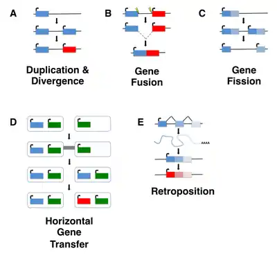 Although de novo gene birth may have occurred at any point in an organism's evolutionary history, ancient de novo gene birth events are difficult to detect. Most studies of de novo genes to date have thus focused on young genes, typically taxonomically restricted genes (TRGs) that are present in a single species or lineage, including so-called orphan genes, defined as genes that lack any identifiable homolog. It is important to note, however, that not all orphan genes arise de novo, and instead may emerge through fairly well characterized mechanisms such as gene duplication (including retroposition) or horizontal gene transfer followed by sequence divergence, or by gene fission/fusion.[5][6]