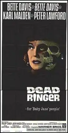 Dead Ringer (also known as Who Is Buried in My Grave?) is a 1964 American horror film made by Warner Bros. It was directed by Paul Henreid from a screenplay by Oscar Millard and Albert Beich from the story La Otra by Rian James, previously filmed in a Mexican version starring Dolores del Río.[1] The music score was by André Previn and the cinematography by Ernest Haller. The film stars Bette Davis, Karl Malden and Peter Lawford with Philip Carey, Jean Hagen, George Macready, Estelle Winwood, George Chandler and Cyril Delevanti.