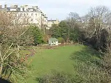 The land on which the Dean Gardens presently stand were used as a grazing ground for sheep until their purchase as part of 140 acres bought by Colonel Alexander Learmonth, the son of the Provost of Edinburgh, John Learmonth, in the middle of the 19th century.[6] Learmouth intended to continue the property development schemes that had seen him construct the terraced housing developments that make up the present Eton Terrace, Oxford Terrace, Belgrave Crescent and Lennox Street. Concerned by the encroaching developments and potential landslips, local residents persuaded Learmonth to grant them a 12-year lease on the site and quickly set to raising the necessary funds for its purchase. Learmonth retained the right to dispose of rubble on the site.[1] £5 was charged to each household and the site of the gardens was eventually bought for £2,500 several years after having opened in 1867.[6][10] The initial list of plants purchased for the gardens cost £400 and a levy was charged on households to pay for the gardens upkeep and to maintain the debt incurred in the purchase. The debt was finally paid off in 1891.[6] The equivalent of £1.8 million in present money was spent on the creation of the original gardens.[11]