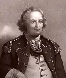 Dearborn, at age 23, organized and led a local militia troop of 60 men from New Hampshire upon hearing the news of the battles at Lexington and Concord, and joined up with Colonel John Stark's 1st New Hampshire Regiment.[5] They eventually arrived at Charlestown shortly after the British had begun firing their cannon at the American positions.[6] General Putnam, second in command to Colonel William Prescott,[7][lower-alpha 2] and reportedly eager for battle, was already at Cambridge before the battle[lower-alpha 3] with 250 of his men from Connecticut.[4] During this time, he received a private proposal from British Commanding General Howe that, if he would relinquish the rebel forces under his command, he would be made a Major-General in the British Army and be compensated for his effort. Putnam kept the matter private, but pointedly rejected the offer.[9]